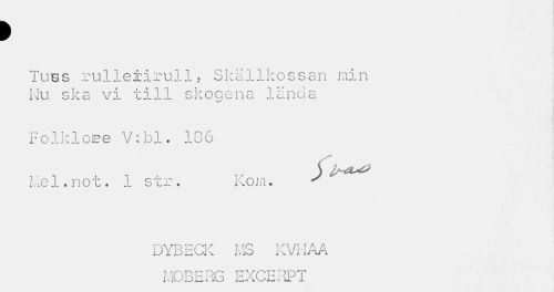 //// > //// Tubs rulleiirull, Skällkossan min Nu ska vi till skogena lända //// Folklore V:bl. 186 //// Mel.not. 1 str. Kom. ^ //// DYBECK MS KVHAA MOBERG EXCERPT ////