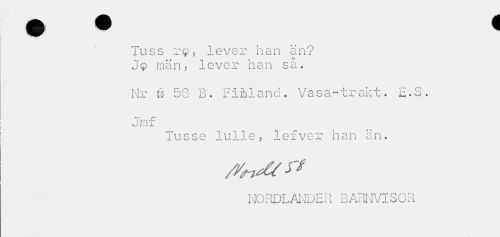 //// Tuss r$ ? lever han än? Jq män, lever han så. //// Nr & 53 B. Firhland. Vasa-trakt. E.S. 3m f //// Tusse lulle, lefver han än. //// /y<nM r/ //// NORDLÄNDER BARNVISOR ////