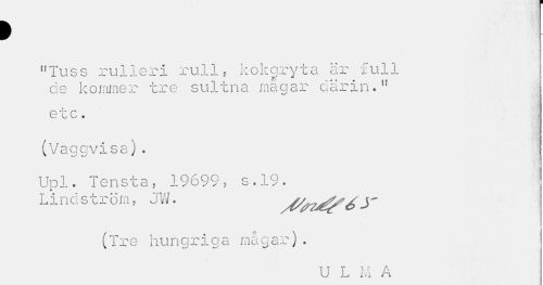 //// > //// "Tuss rulleri rull, kokgryta är full de kommer tre sultna magar öärin." //// etc. //// (Vaggvisa). //// Upl. Tensta, 19699, s.19. L i n d strö m, JW. /fifa&é J~ //// (Tre hungriga mågar). //// U L M A ////