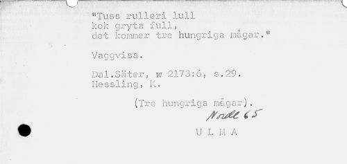 //// "Tuss rulleri luli kok gryta full, //// det kommer tre hungriga magar." //// ) - . ' //// Vaggvis //// a • //// » //// Dal.Säter, w 2173:6, s.29. Hessling, K. //// (Tre hungriga mågar). ////