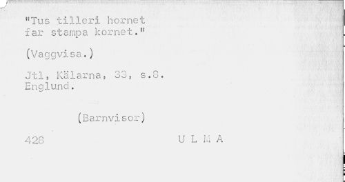 //// nTus tilleri hornet far stampa kornet." //// (Vaggvisa.) j //// Jtl5 Kalarna? 3o? s.8 . Englund. //// (Barnvisor) //// 428 U L M A ////