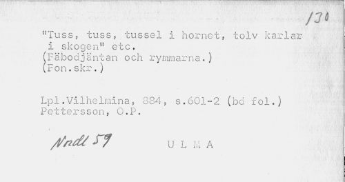 //// /JU //// "Tuss, tuss, tussel i hornet, tolv karlar I skogen" etc. (Fäbodjäntan och rymmarna.) (Fon.skr.) //// Lpl.Vilhelmina, 884, s.601-2 (bd fol.) //// Pettersson, O.P. //// * //// SJ U L M A ////