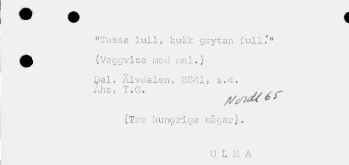 //// "Tussa lull, kuäk grytan full T" Ép (Vaggvisa med mel.) //// Dal. Älvdalen, 8841, s.4. //// o ? ? //// A k o T O* //// jrti i o j jl * vj « É j / //// (Ire hungriga magar). //// U L M A ////