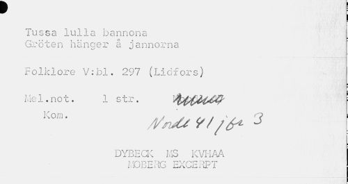 //// i I' //// j //// Tussa lulla b 3 n n o n a //// ¦ //// Gröten hänger å jannorna Folklore V:bl. 297 (Lidfors) //// ¦ //// Mel. not. 1 str. tftf^M^fy //// 1<ok" * /3 : //// DYBECK MS KVHAA MOBERG EXCERPT ////