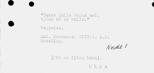 //// J //// "Tussa lulla barna små, tjäna mä en bulla." //// Vaggvisa. //// Dal. Hedemora, 3572:4, s.9. Hessling. //// AJ<rM { //// (För en liten kaka). //// U L M A ////