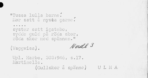 //// p //// "Tussa lulla barnet Ivior satt å nysta garne. //// syster satt igatebo, sydde guld på röda skor, röda skor med spännen." //// (Vaggvisa). * //// Upl. Harbo, 303:946, s.17. Martinelie . //// (GulIskor å spänne) U L M A ////