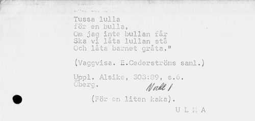 //// «* A. . - ' . . //// . . ¦¦ -1 » //// Tussa lulla //// för en bulla, //// Om jag inte bullan far //// Ska vi låta lullan stå //// Oc h låta b arne t orå ta." //// (Vaggvisa. E.Cederströms saml.) //// Uppl. Alsike, 303:89, s.6. Öberg. ^^ / //// ff^ (För en liten kaka) . //// U L IÅ A ////