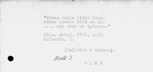 //// "Tussa lulla liten kinn, Mamma kommer rätt nu in. ... nya skor me spännen." //// Häls. Arbrå , 8731, s.15. Kolmodin, R. //// (Gullskor å spänne). //// m 4/^3 //// U L M A ! ////
