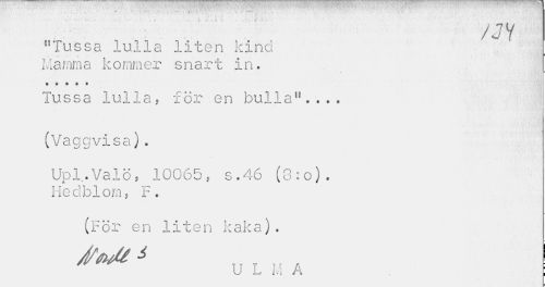 //// W- * » //// r f //// : . . //// /JV //// "Tussa lulla liten kind Mamma kommer snart in. //// Tussa lulla, för en bulla11... (Vaggvisa). //// Upl.Valö, 10065 f s .46 (3:o). Hedblom, F. //// (För en liten kaka). //// J/frjä 3 , i //// ^ U L K A ; ////