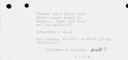 //// "Tussa lulla liten kind Mamma kommer snart in Pappa... köper nya skor med guldspännen". //// (Vaggvisa 3 var.) //// Upl. Harbo , 303:942, s.48-49 (16:o) Martinelie. //// (Oullskor å spänne). ^ //// U L M A ////