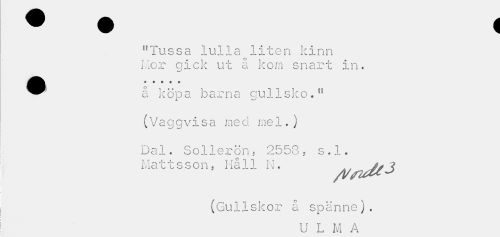 //// "Tussa lulla liten kinn Mor gick ut å kom snart in. //// å köpa loarna gulisko." //// (Vaggvisa ined mel.) //// Dal. Sollerön5 2558, s.1. i vi a t "c s s o n« Ha 11 N. i/^é^ ^ //// (Gullskor å spänne). //// U L M A ////
