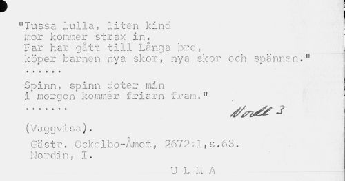 //// MTussa lulla? liten kind mor kommer strax in. Far har gått till Långa bro, //// köper barnen nya skor, nya skor och spännen." //// Spinn, spinn doter min i morgon kommer friarn fram." //// (Vaggvisa) . //// Gä str. Ockelbo-Amot, 2672;1,s.63. Nordin, I. //// U L i.i A ////
