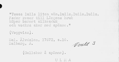 //// > //// "Tussa lulla liten vän,lulla,lulla,lulla, //// Fader reser till Långena bruk köper barnet silkesd.uk //// och vackra skor ned spänne." (Vaggvisa). //// Dal. Älvdalen, 17672, s.16. //// Dalborg, A. sfl&zUS $ //// (Guliskor å spänne). //// U L M A ////