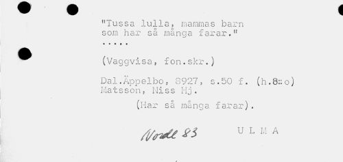 //// "Tussa lulla, mammas barn //// s om har s å må ng a f ar ar.n • • ? # • //// ^^ (Vaggvisa, fon.skr.) //// Dal.Äppelbo, 8927, s.50 f. (h.8::o) Matsson, Miss Hj. //// (Har så många farar). //// /j/rvtt u L M A //// m B //// s ////