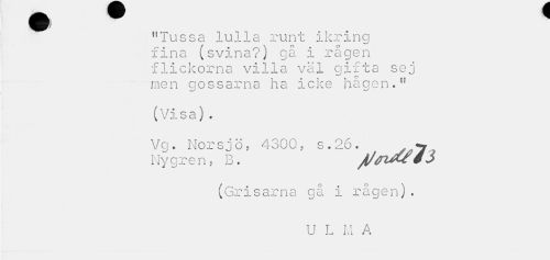 //// 11 ; //// "Tussa lulla runt ikring fina (svina?) gå i rågen flickorna villa väl gifta sej men gossarna ha icke hågen." //// (Visa). //// Vg. Norsjö, 4300, s.26. f j Ny gr e n, B. Jt/n&é J //// (Grisarna gå i rågen). //// U L M A ////