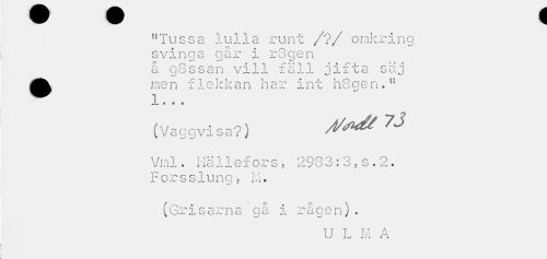 //// W W I //// "Tussa lulla runt /?/ omkring svinga qår i r3gen a gSssan vill fäll jifta säj //// •men flekkan har int h8aen." //// / //// 3- • • e //// (Vaggvisa?) ^^ 7J //// Vrnl. Hällefors, 2933:3,s.2. //// Forsslung, 1.1. //// i—' //// (Grisarna gå i rågen). //// U L M A ////