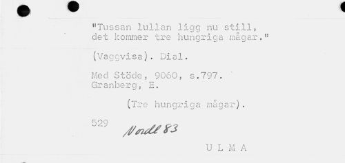 //// ^T B ™ //// v w //// "Tussan lullan ligg nu still, det kommer tre hungriga mågar." //// ' W - w/ //// (Vaggvisa). Dial. //// Med Stöde, 9060, s.797. Granberg, E. //// (Tre hungriga mågar). //// U L M A ////
