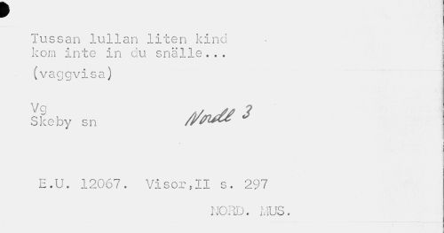 //// r //// Tussan lullan liten kind kom inte in du snälle... //// (vaggvisa) //// Ske by sn 2 //// ii //// E.U. 12067. Visor,11 s. 297 //// NORD. MUS. ////