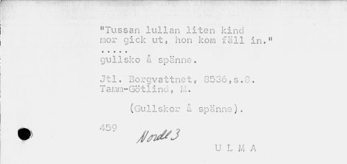 //// ... ... i .• ... //// :...•' . .V. //// "Tussan lullan liten kind mor gick ut? hon kom fäll in." //// « e • • c //// gulisko å spänne. //// Jtl. Borgvattnet? 8536?s.8. T a mm ~Gö 11 i n d ? iVi. //// (Gullskor å spänne). //// ^ 450 //// • - J/tJs3 //// U L M A ////