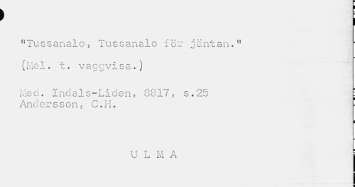 //// "Tussanalo, Tussanalo för jäntan*11 (Mel. t. vaggvisa.) //// Med. Indals-Liden, 8817. s.25 ; //// Andersson, G.H. ¦ //// i //// U L M A //// ... ////