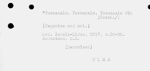 //// "Tussanalo? Tussanalo? Tussanalo för //// jäntan:/: //// m^ (Vaggvisa med mel.) //// Med. Indals-Liden ? 13817, s. 24-25. Andersson? C.H. //// (Barnvisor) //// U L M A ////