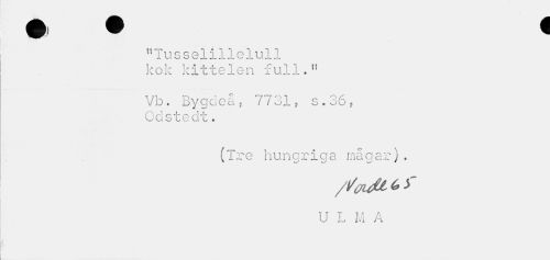 //// m //// "Tusselillelull kok kittelen full." //// Vb. Bygceå, 7731, s.36, Ocstedt. //// (Tre hungriga mågar). //// U L M A ////