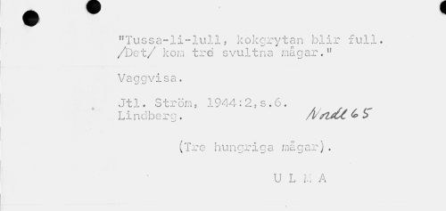 //// "Tussa~li~lull, kokgrytan blir full. /Det/ kom tre svultna mågar." //// Vaggvisa. //// Jtl. Ström, 1944:2,s.6. //// Lind ber o. ArtjU&Z //// (Tre hungriga mågar). //// U L l: A ////