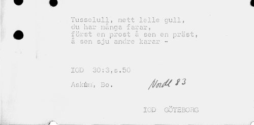 //// 1 //// Tusselull? mett lelle gull? clu har många farar? först en prost a sen en präst, å sen sju andre karar - //// IOD 30:0,. s. 50 //// As km/n', Bo. /fe^ $ J //// IOD GÖTEBORG ////