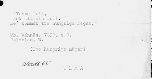 //// "Tusse luli, kok kitteln full. De' kommer tre hungriga mågar." //// Vb. Vännäs, 7393, s.3. i //// Palmblad, W. 5 //// — //// (Tre hungriga mågar). r //// /l/tn^éér j //// U L M A I ////