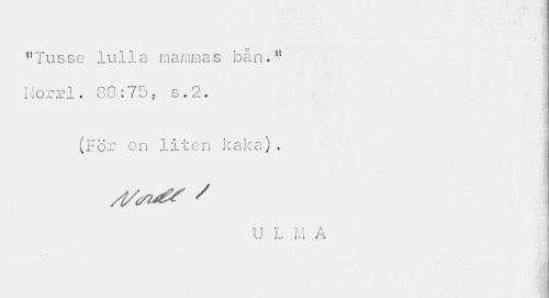 //// "Tusse lulla mammas bån." Horrl. 88:75, s.2. //// (För en liten kaka). //// U L M A ////