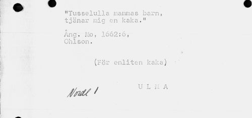 //// Hl //// "Tusselulla mammas barn5 tjänar mig en kaka." //// Ang. Mo, 1662:6, Ohlson. //// ii» //// (För enliten kaka) : ' ,, / U L M A ////