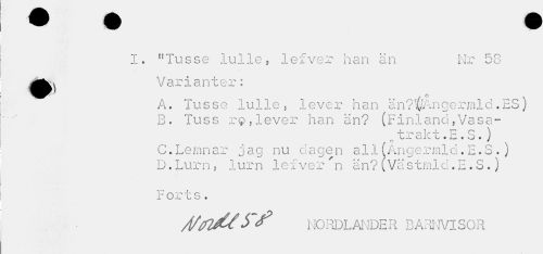 //// I. nTusse lulle, 1efver han än Nr 58 //// Varianter: //// , o . //// A. Tusse lulle, lever han än?l(JAngermld .ES) //// B. Tuss r®,lever han än? (Finland,Vasa- //// »4— .--> < ~ \ //// Li aii L § L « O t J //// C.Lemnar jag nu dagen all(Angermld.E.S.j //// D.Lurn, lurn lefver n än?(Västmlc.E.S.) //// Forts. //// /i/lHjUNORDLANDER BARNVISOR ////