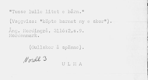 //// "Tusse lulle litet e barn," (Vaggvisa: "köpte barnet ny e skor"), //// o 0 //// Ang. Moroingra, 3116:2,s.9. Nord en/nar k. //// K //// (Guliskor å spänne). //// U L M A //// ( ////