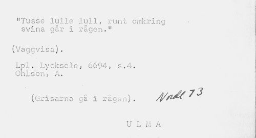 //// "Tusse lulle lull, runt omkring svina qår i rågen." //// (Vaggvisa). //// Lpl. Lycksele? 6694, s.4. Ohlson, A. //// (Grisarna gå i rågen) . 73 //// i //// U L M A ////