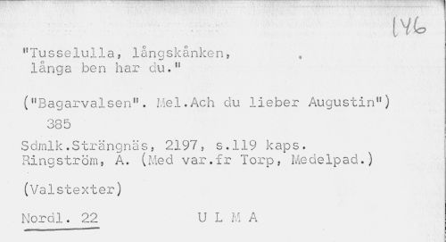 //// i Vt //// lfTusselulla, långskånken, långa ben har du.11 //// ("Bagarvalsen". Mel.Ach du lieber Augustin11) 385 //// Sdmlk.Strängnäs, 2197, s.119 kaps. Ringström, A. (Med var.fr Torp, Medelpad.) //// (Valstexter) //// Nordl. 22 U L M A ////