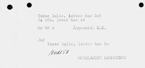 //// Tusse lulle, lefver^han än? Jq män, lever han så //// Nr 58 A Ångermld. E.S. //// •~r- r**» //// j mf //// Tusse lulle, lefver han än //// NORDLANDER BARNVISOR ////
