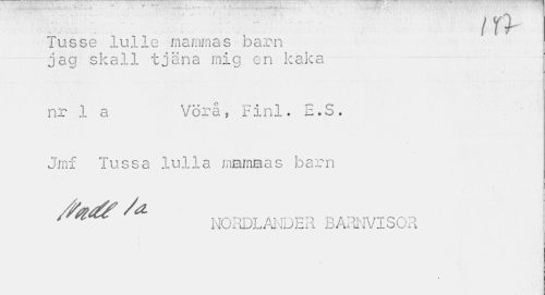 //// in //// Tusse lulle mammas barn jag skall tjäna mig en kaka //// a v or a , ¦ Jr ml. c.o. //// Jmf Tussa lulla marnaas barn //// ' NORDLANDER BARNVISOR //// \ ¦ I ////