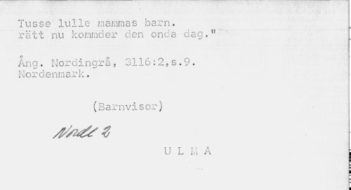 //// Tusse lulle mammas barn. rätt nu kommaer den onda dag.n //// : //// \ //// ö //// Ang. Nordingrå, 3116:2,s.9. Nordenmark. //// . //// (Barnvisor) //// U L V: A ; //// P ////