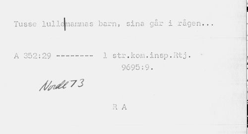 //// I //// Tusse lullamammas barn, sina går i rågen... //// A 352:29 --- 1 str.kom.insp.Rtj. //// 9695:9. ' //// /t/^yj //// ¦ //// R A ////