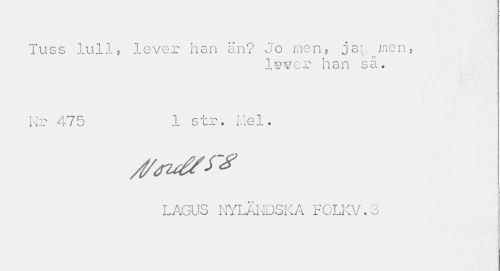//// Tuss lull, lever han än? Jo men, jar, men, //// l^ver han så. //// Nr 475 1 str. Mel. //// /t/su&S-* //// LAGUS NYLÄNDSKA FOLKV.3 ////