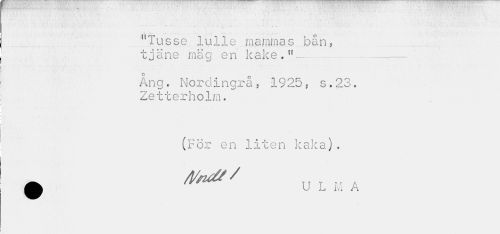 //// ... •* 1 ~ ' - " • //// ¦ //// !. '.-¦ ..." _ r ' K ¦ •- ¦ - - //// "Tusse lulle mammas ban, //// tjäne mag en kake.,f— —,—- //// o 0 //// Ang. Nordingra.f 1925 ? s.23. Zetterholm. //// (För en liten kaka). //// 9 fa*7 U L M A ////