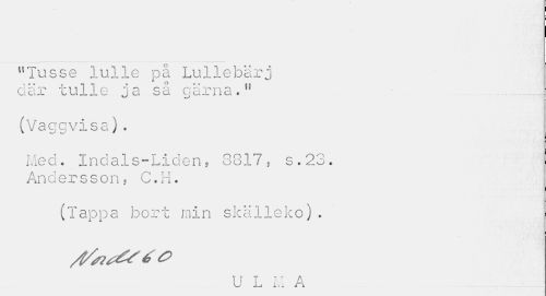 //// Ulusse lulle på Lullebärj elär tulle ja så gärna.11 //// (Vaggvisa). //// Mecl. Indals-Liden, 3817, s.23. Andersson, C.H. //// (Tappa bort min skälleko). //// /t/^^éO //// T T T J " A U ju i. i ri ////