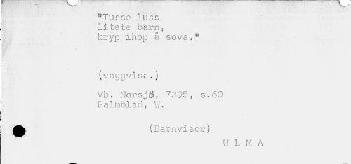 //// "Tusse luss litete barn f kryp ihop å sova.15 //// ^V®^ t »viw //// (vaggvisa.) //// Vb. Norsjö 5 7395, s. 60 Palmblad, 17. //// (Barnvisor) //// U L M A ////