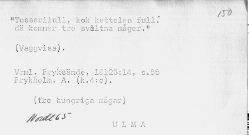 //// "Tusserilull, kok kettélen full. dä kommer tre svchltna mager. //// (Vaggvisa). //// Vrml. Fryksände, 18123:1-4, s.55 Frykholm, A. (h.4:o). //// (Tre hungriga mågar). ' U L M A j ////