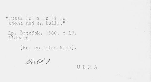 //// nTussi lulii lulli lu, tjena mej en bulla." //// Lp. Orx rask? o 5 8 O $ s «1o« //// Lidberg. //// (För en liten kaka) . //// U L M A //// V ////