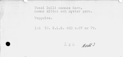 //// Tussi lulli mammas 'barn, mamma sitter och nystar garn. //// Vaggvisa. //// 1:6 TJ. S.L.S. 422 s.87 nr 79. • ÅBO rffJ/3 ////