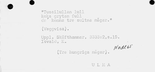 //// ^^¦r I //// "Tussilul1an lul1 //// koka grytan full //// de' komma tre sultna mågar." //// (Vaggvisa). //// Uppl. Skafthammar? 3333:2,s.15. 1 svald• //// k. //// (Tre hungriga magar). //// U L M A ////