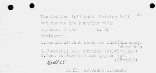 //// Tussirulian lull koka kittelen full det kommer tre hungriga magar Har q emo 5 Nrke s . 26 //// « //// Varianter* //// 1•Tussrilull,kok kettelän full(Brunskog, //// Värmland) //// 2.Tusselull jlcok kettelen full (Småland) S.Tuss lullerilull,kok grytan full //// y^r ~ (Västmld) //// STRÖM SV. VISOR o . RAMSOR ////
