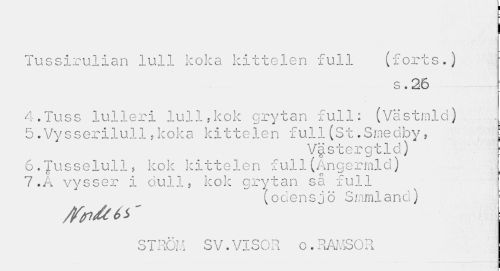 //// I //// Tussirulian lull koka kittelen full (forts/) //// s. 26 //// 4.Tuss lulleri lull,kok grytan full: (Västmld) //// 5.Vysserilull,koka kittelen full(St•Smedby, ; //// V^stergtld) : //// 6.Tusselull> kok kittelen full(Angermld) //// 7.A vysser i dull, kok grytan så full //// (odensjö Smmlanc) //// STRÖM SV. VISOR o . RAMSOR ////