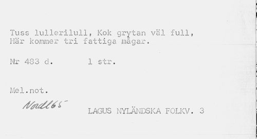 //// ' i //// Tuss lullerilull, Kok grytan väl full, Här kommer tri fattiga magar. //// r //// Nr 483 cl. 1 str. : //// i //// Me 1.not. //// LAGUS NYLANDSKA FOLKV. 3 ////
